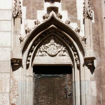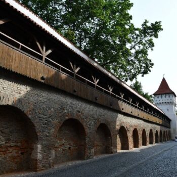 Its broken roof, with two observation turrets on the south and north sides, gives it a distinctive appearance. From this tower comes the stone tablet with the oldest coat of arms of the city and the motto “Nomen Domini, turris fortissima” (translated: “The name of the Lord is the strongest fortress”), which is preserved in the History Museum in the Clock Tower (Turnul cu Ceas) in Sighisoara (German: Schäßburg).